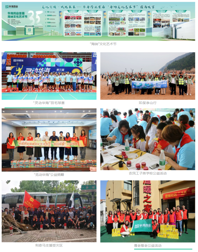 华海药业坚持平等雇佣,社会保险覆盖率达100%。特色福利如孝心基金累计发放近亿元,股权激励覆盖众多核心人才。公司还建成台州市首家职业健康实训基地,安全培训覆盖全员,隐患整改率保持100%。员工生活同样丰富多彩:海纳文化艺术节、职工羽毛球赛、价值观脱口秀大赛、百人徒步净山活动……华海将人文关怀和社会责任深深融入文化基因,让企业发展与员工幸福、社会进步同频共振。