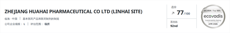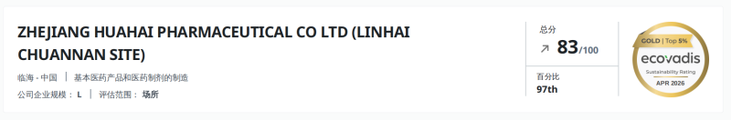 金牌-跻身全球前3% | 华海药业EcoVadis评级交出高分答卷